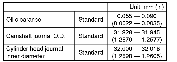 5) Measure the outer diameter of camshaft journal and inner diameter of cylinder head journal, and confirm the difference (oil clearance) between the two values. If the oil clearance is not within the standard, replace the camshaft or cylinder head as necessary.