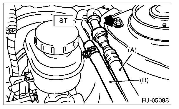 5. In the engine compartment, disconnect the fuel delivery hoses (A) and evaporation hose (B).