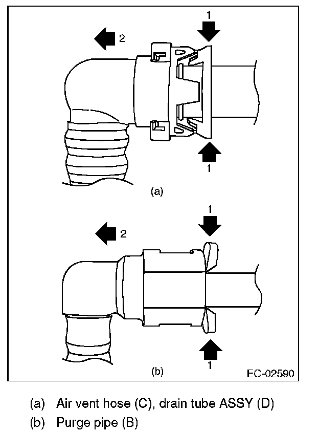 8. Remove the purge hose (A), purge pipe (B), air vent hose (C) and drain tube assembly (D).