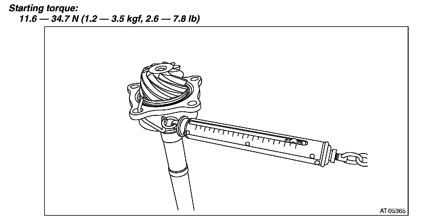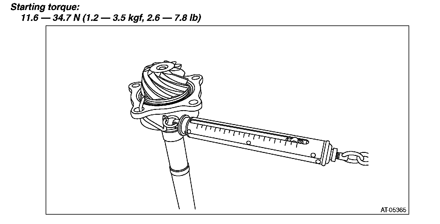 8) Measure the starting torque of the bearing. Make sure the starting torque is within the specified range. If the torque is not within specified range, replace the roller bearing.
