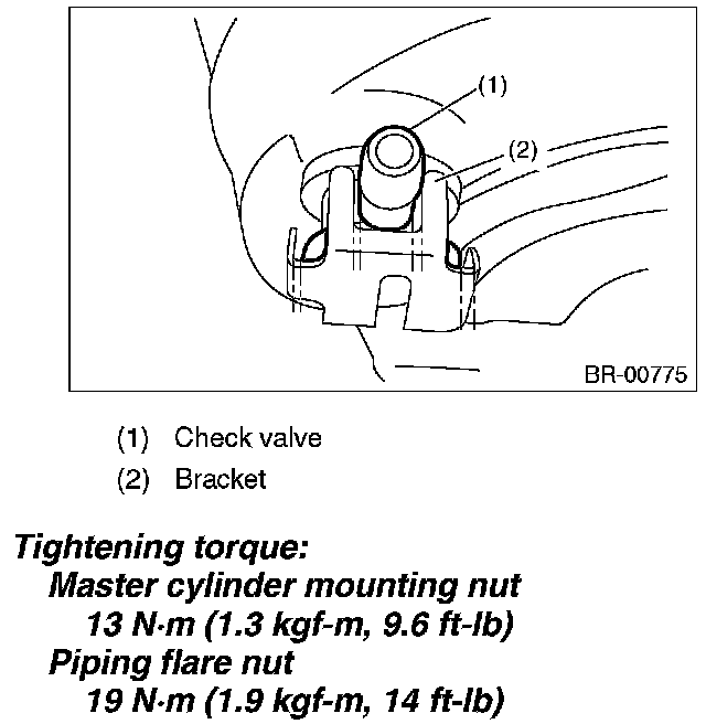 In order to prevent the contact of the bracket and check valve, be sure to loosen the master cylinder mounting nut while holding the bracket with hand. Otherwise it may deform the bracket.