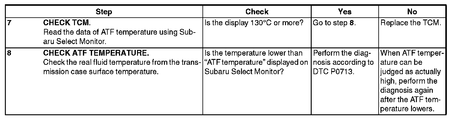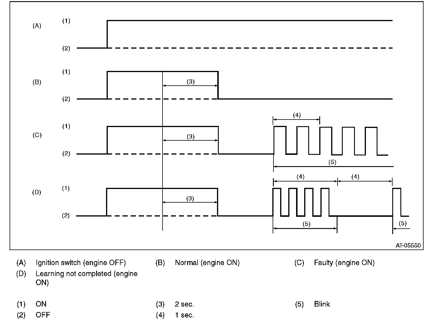 When any on-board diagnostics item is malfunctioning, or the learning has not yet completed, AT OIL TEMP light blinks. Blinking continues from the engine start to the ignition switch OFF. The malfunctioning part or unit can be determined by a DTC. Problems which occurred previously can also be identified through the memory function. If the AT OIL TEMP light does not blink although a problem is occurring, the problem can be determined by checking the performance characteristics of each sensor using the Subaru Select Monitor. If the learning has not yet completed, "AT learning not completed" is displayed when the Subaru Select Monitor is connected while AT OIL TEMP light is blinking. The AT OIL TEMP light blinking will go off, when the learning is performed. Indicator light signal patterns are as shown in the figure.