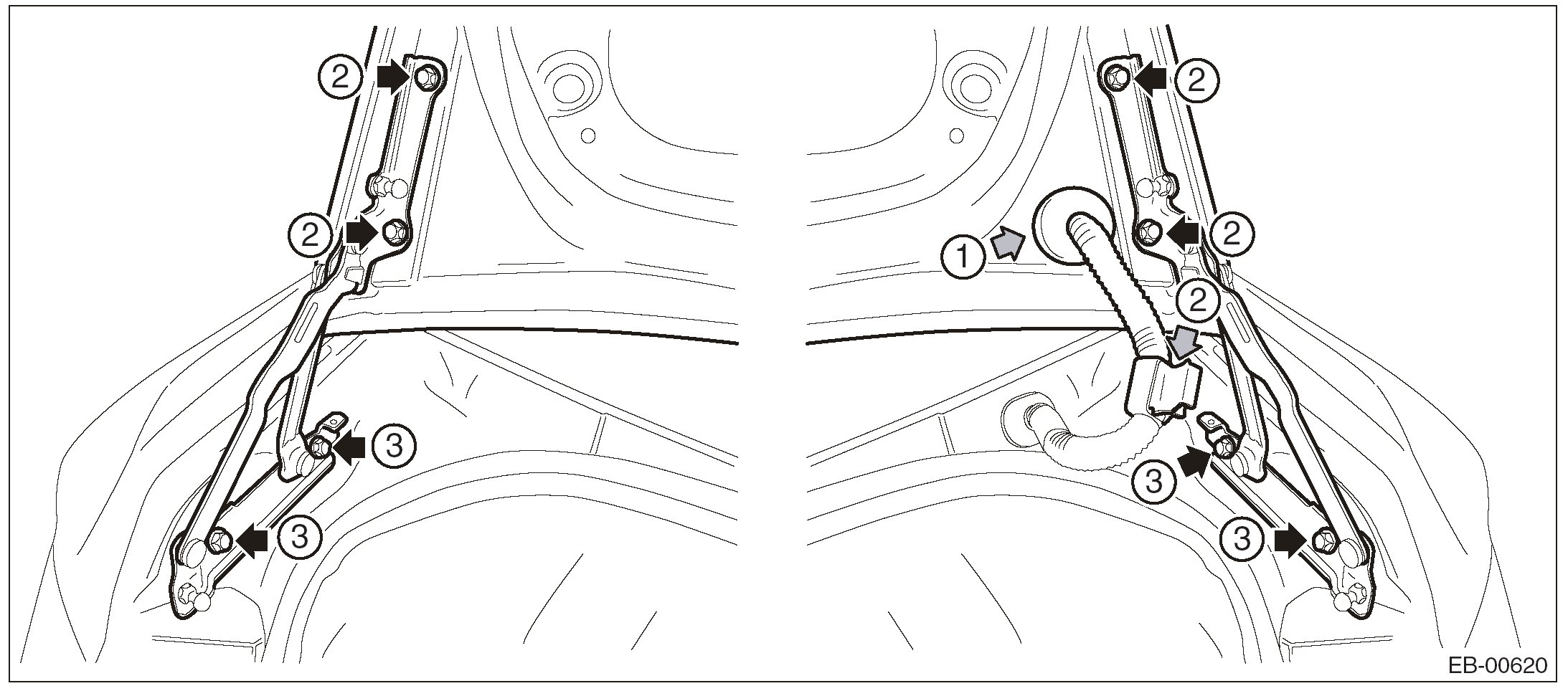 3. Remove the bolts, then remove the trunk lid hinge.