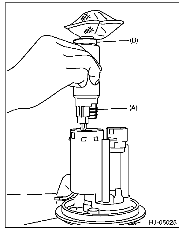 1. Assemble the gasket spacer (A) and support rubber cushion (B) to the fuel pump, and install the fuel pump to the fuel filter assembly.