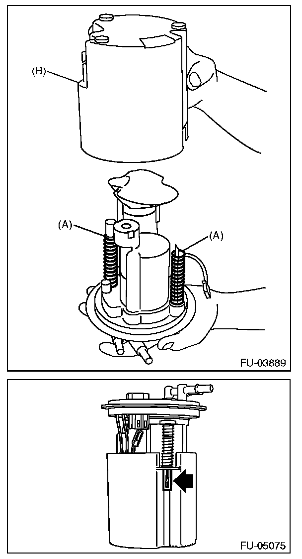 3. Install the pump module spring (A) to fuel filter assembly, and install the fuel chamber assembly (B).