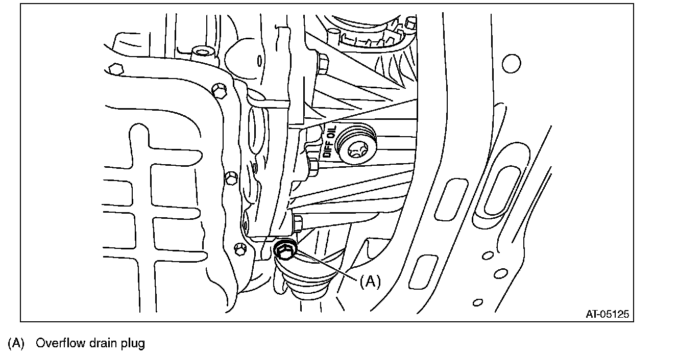 5) When the flow of the differential gear oil turns into a narrow stream, install the overflow drain plug.
