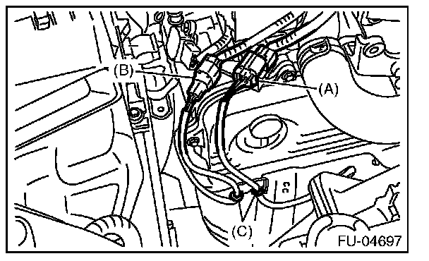 3. Remove the clips (C) fastening the harness and disconnect the rear oxygen sensor connector (B).