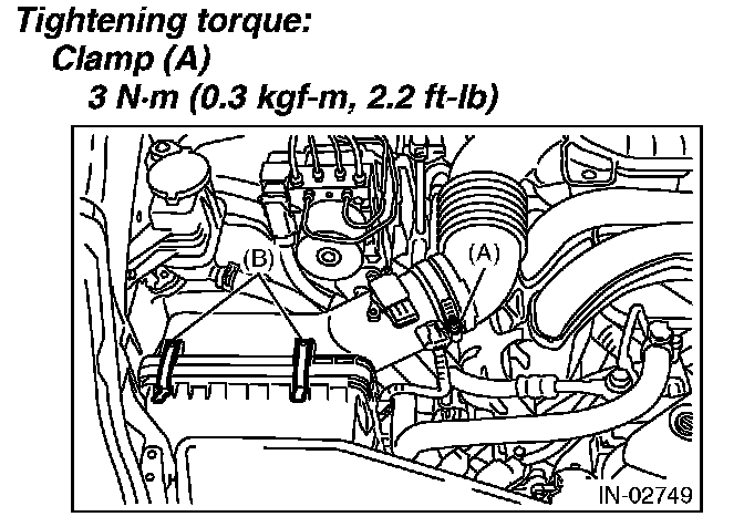 3. Install the clip (B) to the air cleaner case (front), then tighten the clamp (A) that connects the air cleaner case (rear) to the intake boot.
