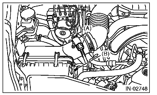 4. Disconnect the connector (A) from the mass air flow and intake air temperature sensor, and remove the clip (B).