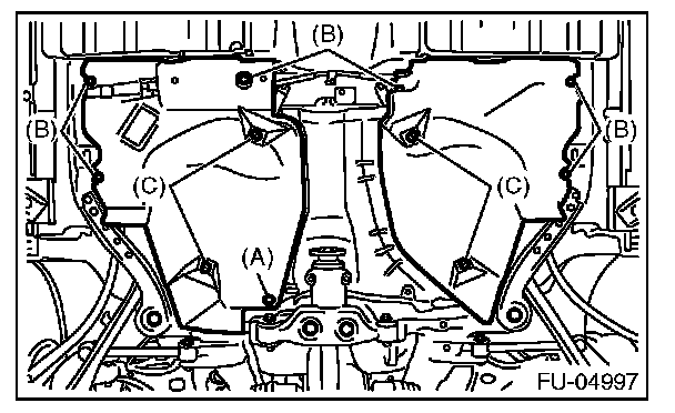 20. Remove the bolts (B) and nuts (C) securing the fuel tank protector, and remove the fuel tank protector.