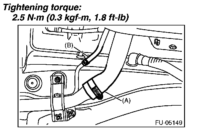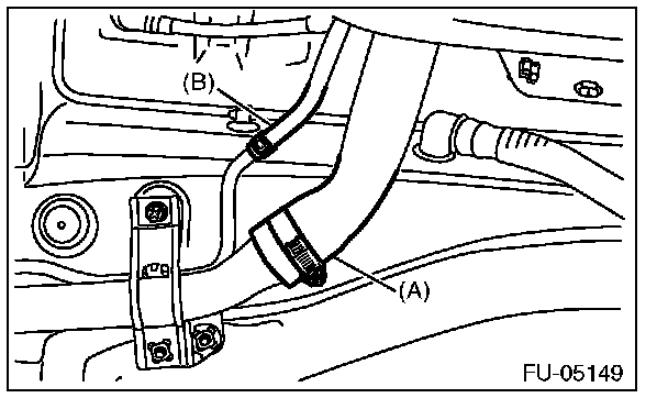 2. Securely insert the fuel filler hose (A) and circulate hose (B) to the spool, then attach the clamp or clip as shown in the figure.
