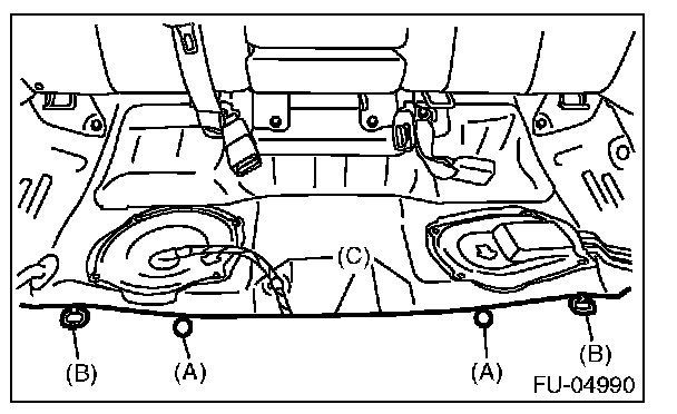 5. Remove the clips (A) and seat cushion hooks (B), and turn over the floor mat (C).