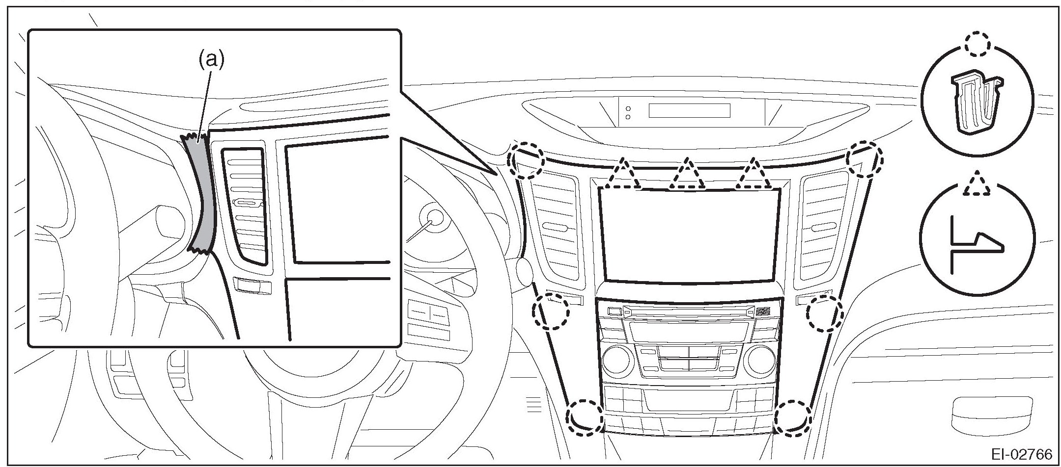 2. Insert a finger into the air vent grille and release the left and right clips at the top of the center panel. (A), (B)