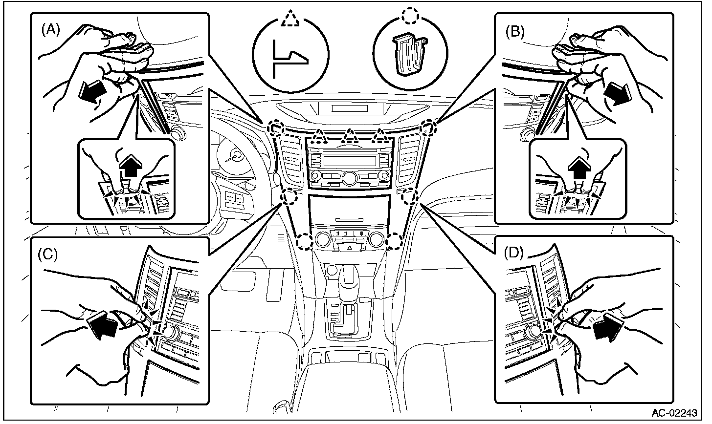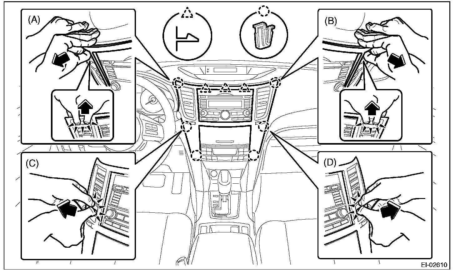 3. Insert a finger into the air vent grille and release the left and right clips at the center of the center panel. (C), (D)