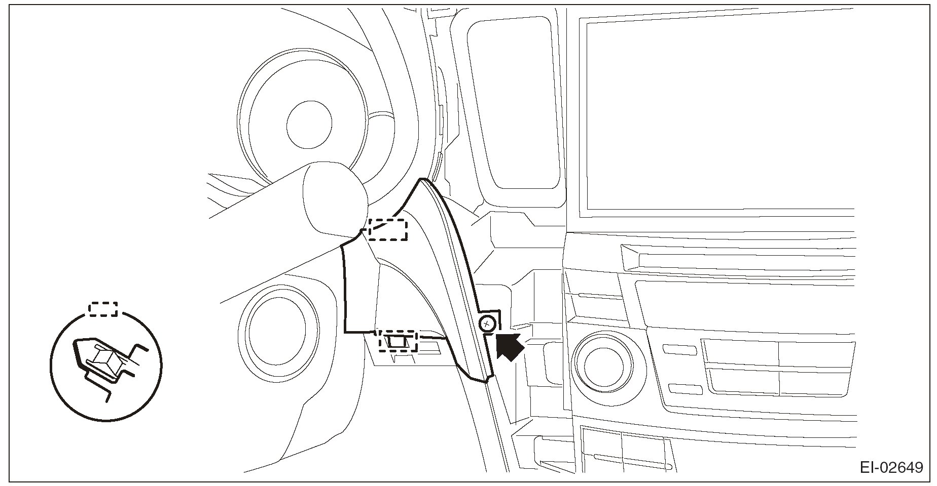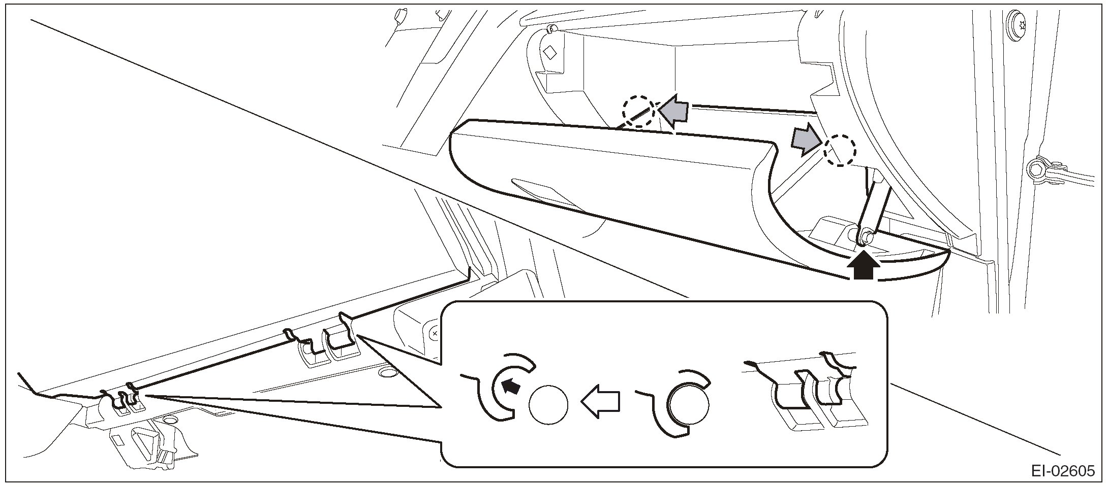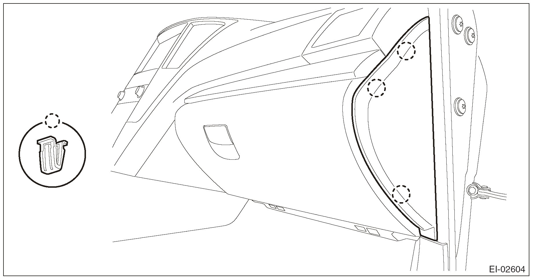 1. Pull the upper part of the front pillar trim towards the center of the vehicle.