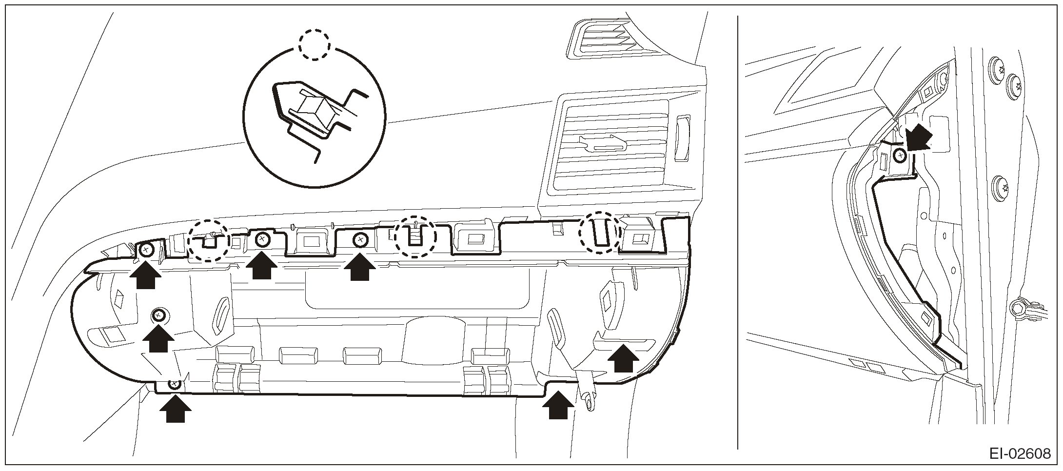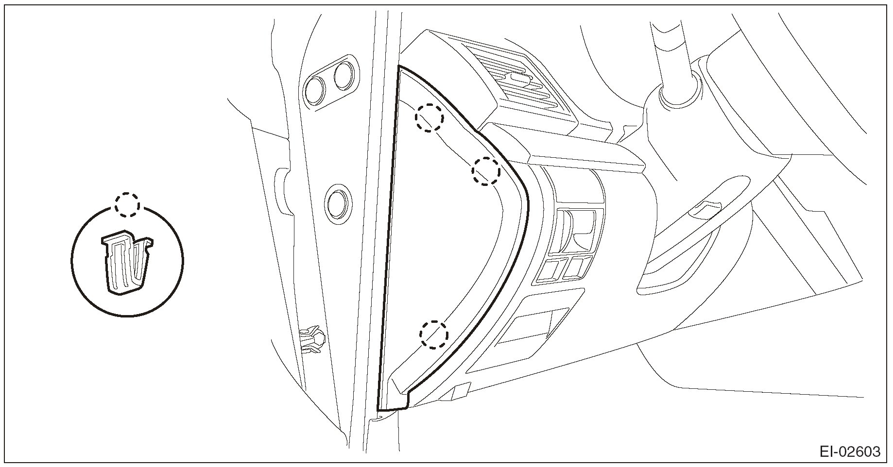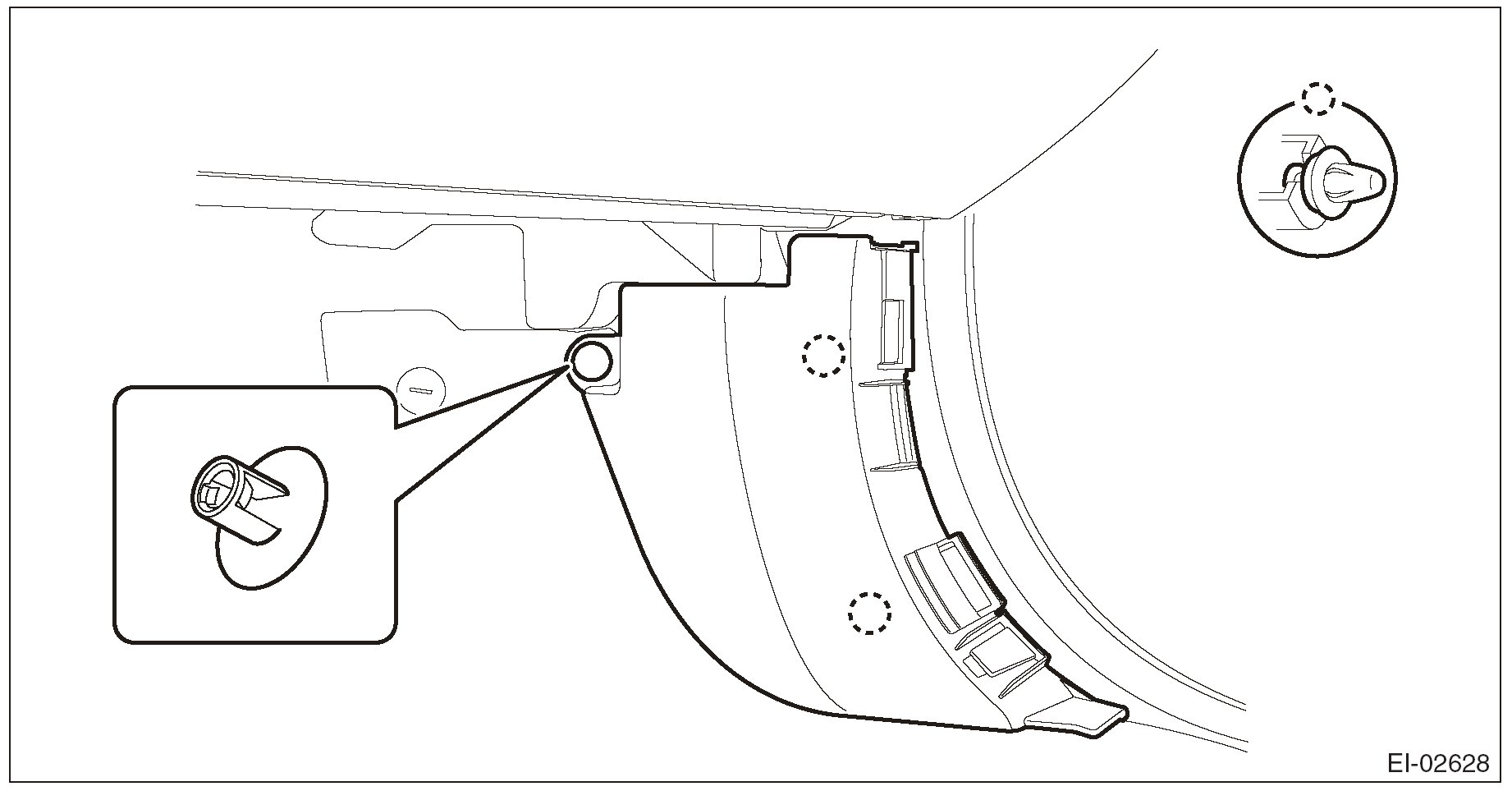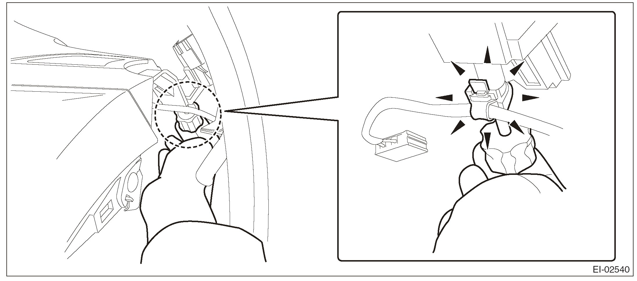 1. Pull the upper part of the front pillar trim towards the center of the vehicle.