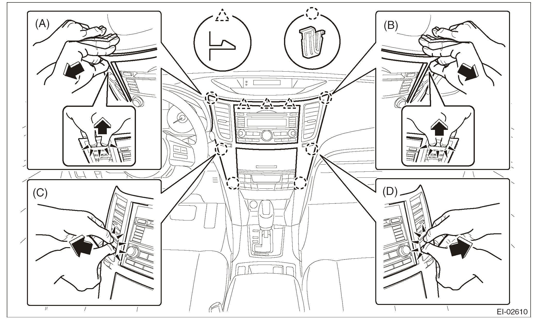 3. Insert a finger into the air vent grille and release the left and right clips at the center of the center panel. (C), (D)