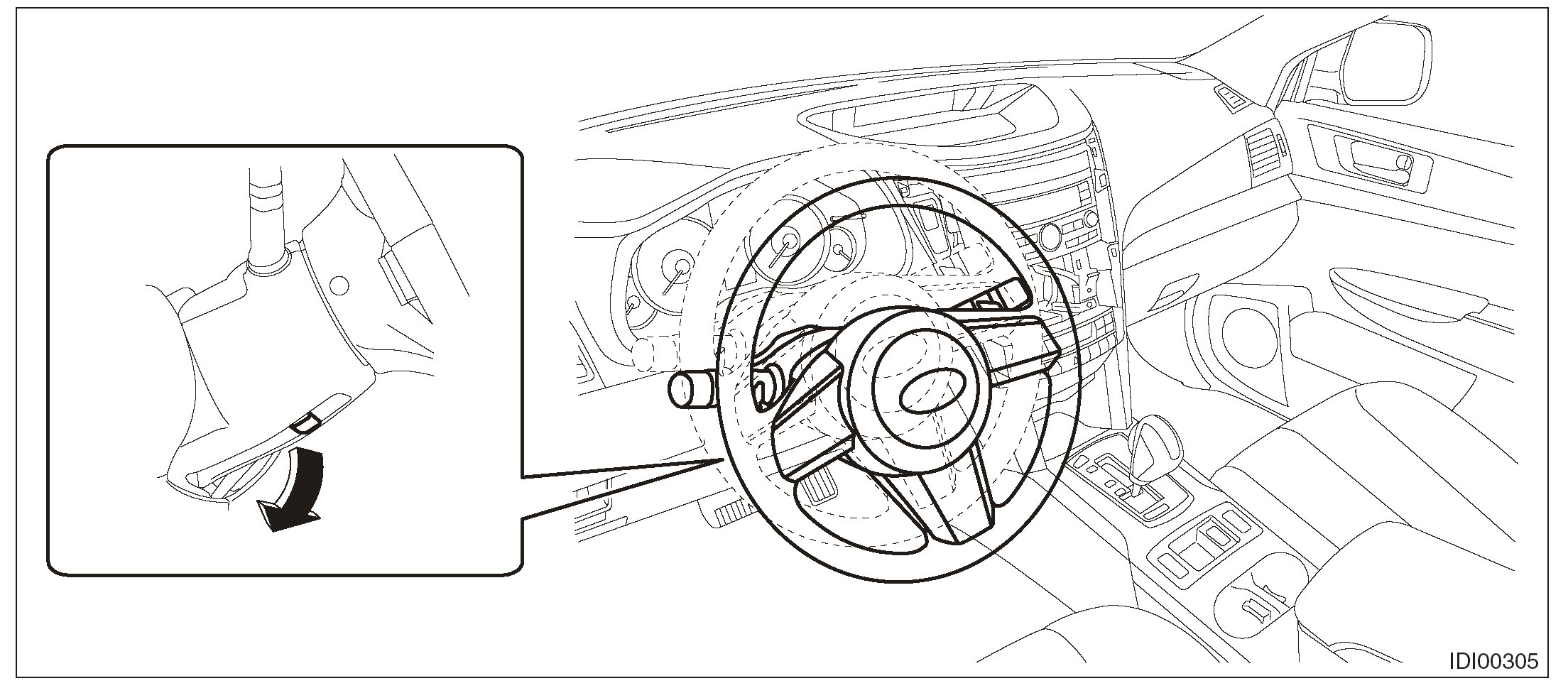 2. Release the lock, tilt the steering column to the lowest end and fully extend the column by the telescopic system.