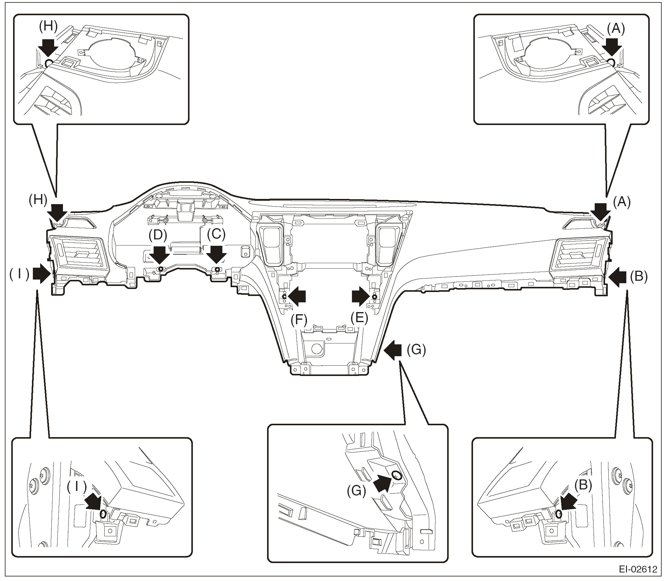 1. Remove the screws. (A), (B), (C), (D), (E), (F), (G), (H), (I)