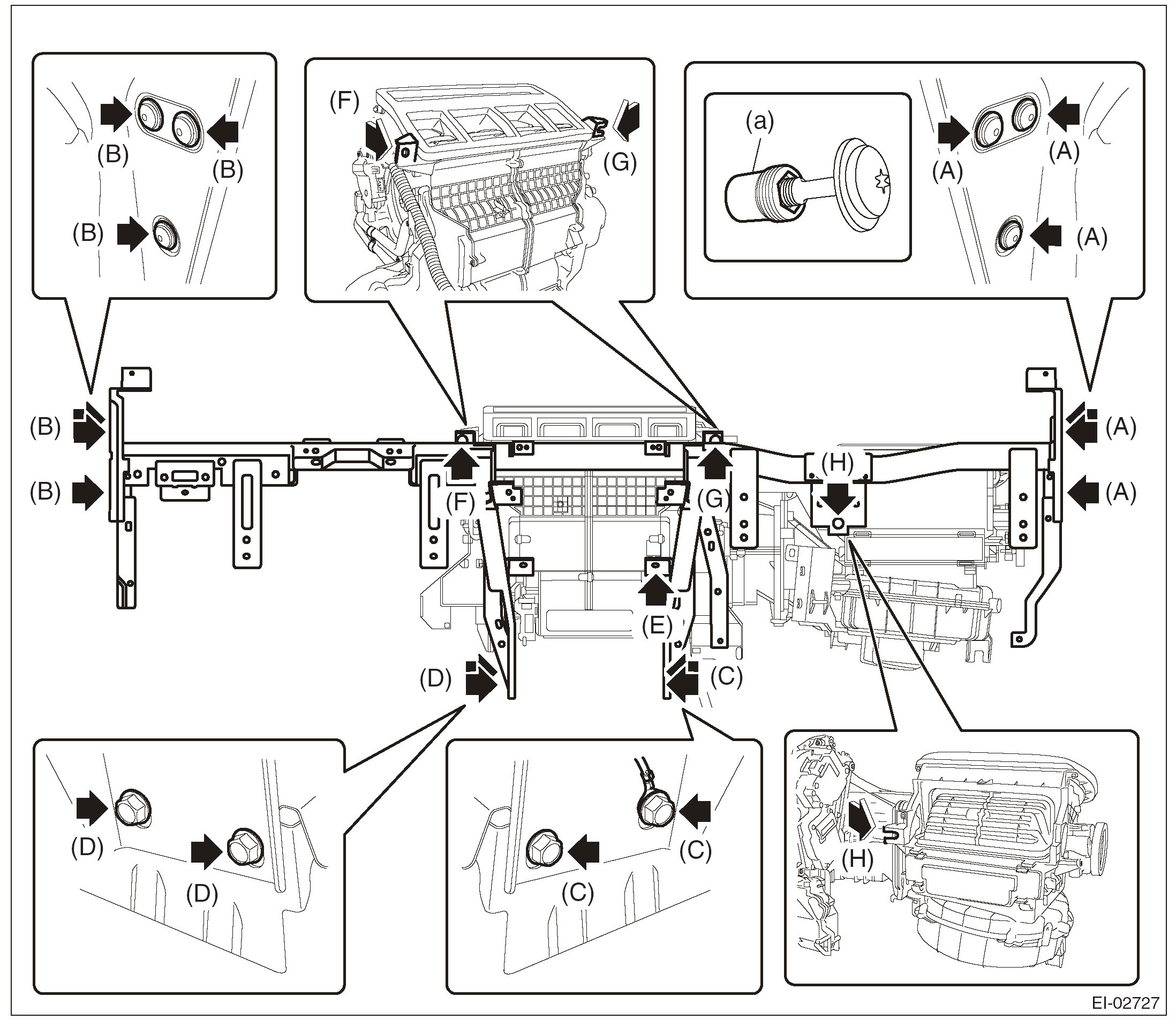 5. Remove the bolts at the floor center. (C), (D)