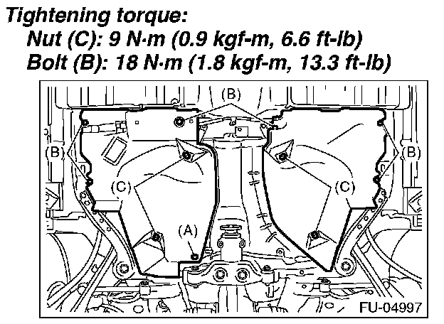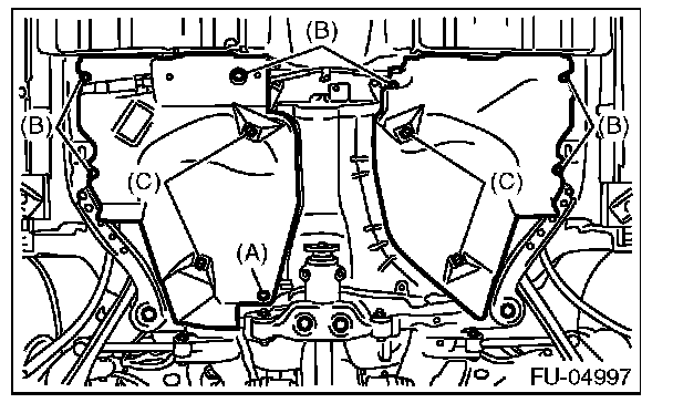 20. Remove the bolts (B) and nuts (C) securing the fuel tank protector, and remove the fuel tank protector.