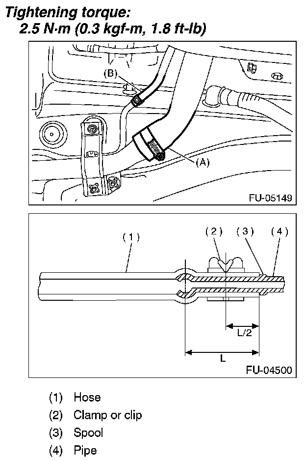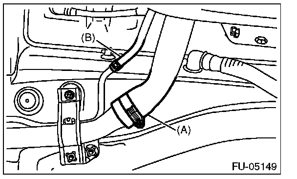 2. Securely insert the fuel filler hose (A) and circulate hose (B) to the spool, then attach the clamp or clip as shown in the figure.