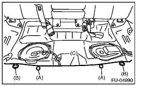 5. Remove the clips (A) and seat cushion hooks (B), and turn over the floor mat (C).