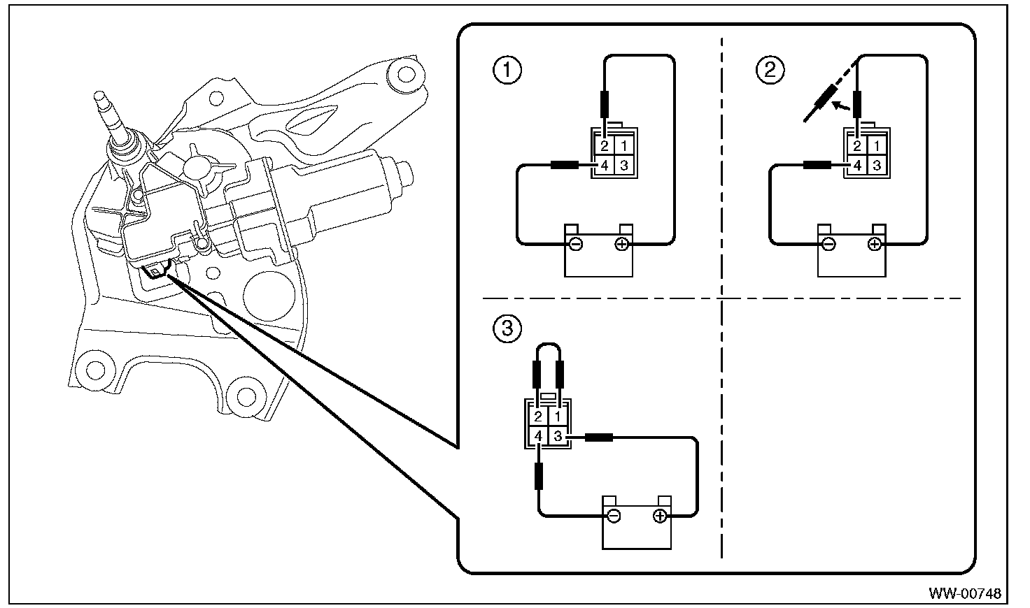 1. Connect the battery to the wiper motor connector and confirm that wiper motor operates.