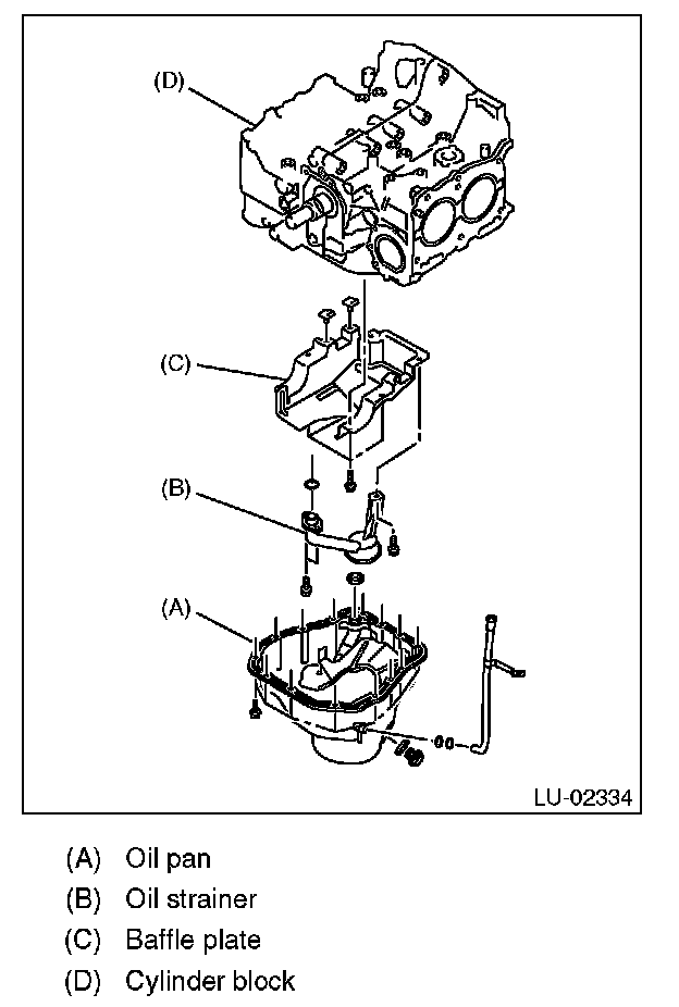 Visually check that the oil pan, oil strainer and baffle plate are not damaged.