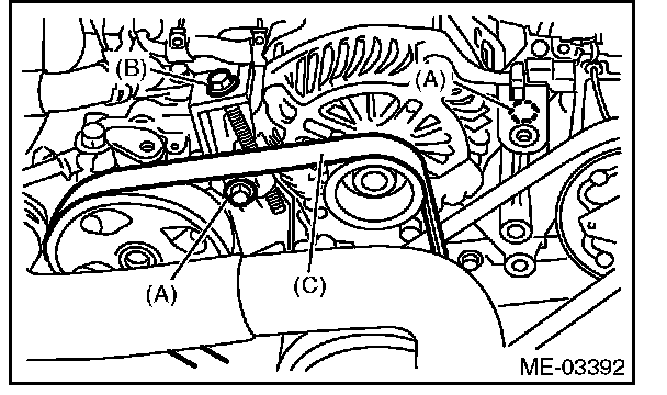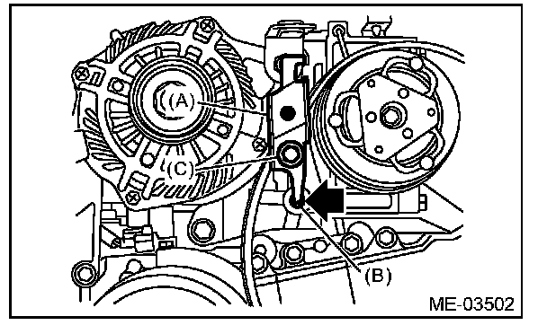 2) Install the front side belt (C), and adjust the slider bolt (B) so as to obtain the specified belt tension.