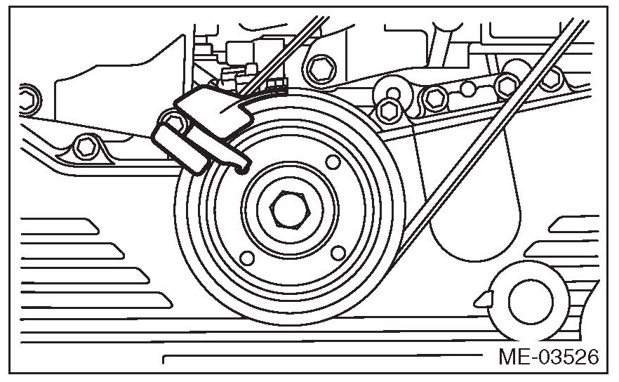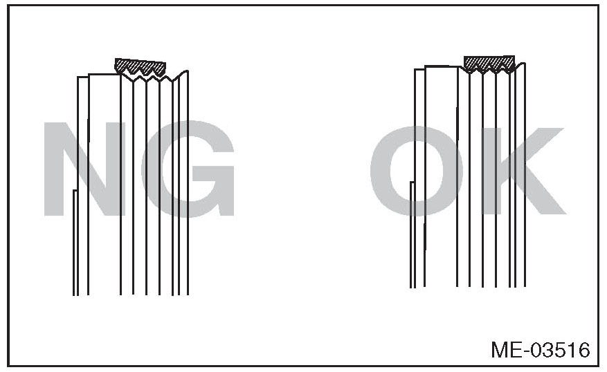 ^ If the front side belt tension is lower, the front side belt and crank pulley slip, causing abnormally high temperature on the crank pulley due to frictional heat. If this condition repeatedly occurs, the front side belt may abnormally wear, causing abnormal noise, front side belt damage or crank pulley damage.