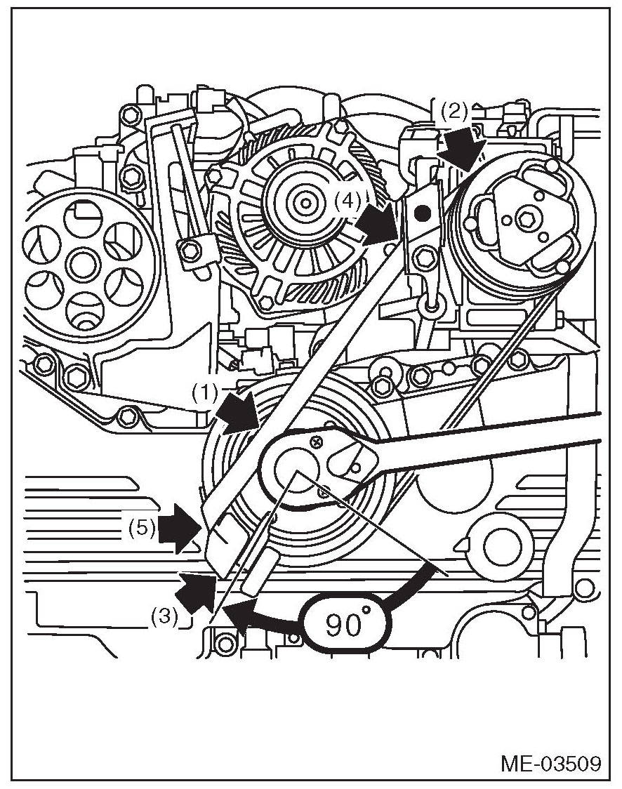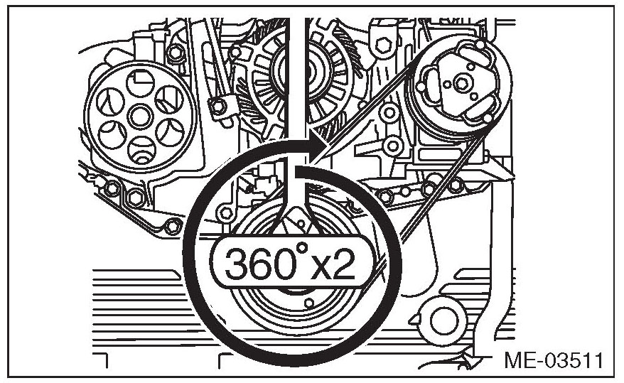 16) Make sure that the belt rib is securely installed on the groove of each pulley, then turn the crank pulley slowly, twice in the clockwise direction, to seat the rear side belt properly.