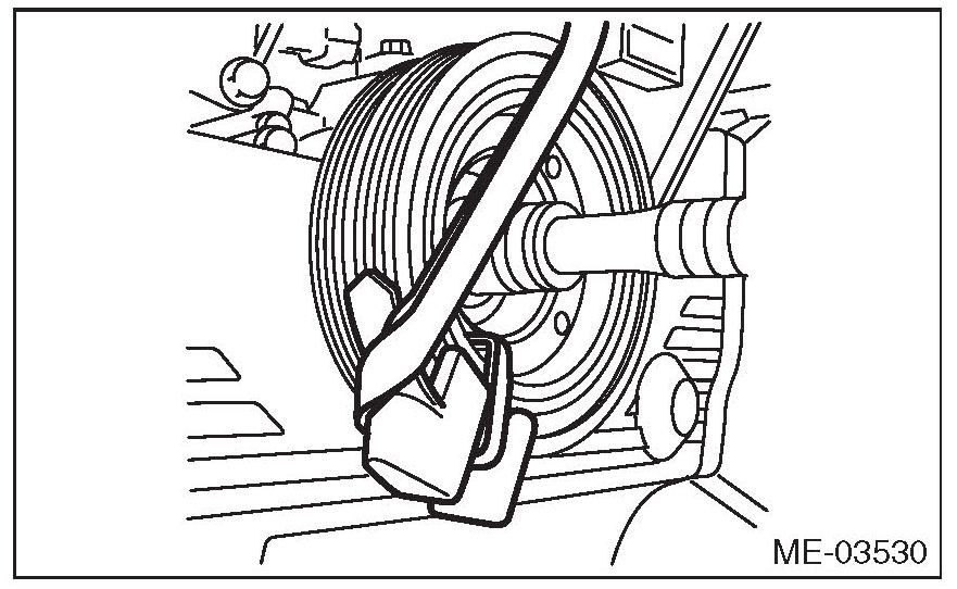 3) Slowly turn the crank pulley clockwise so that the service hole of the crank pulley comes around the top.