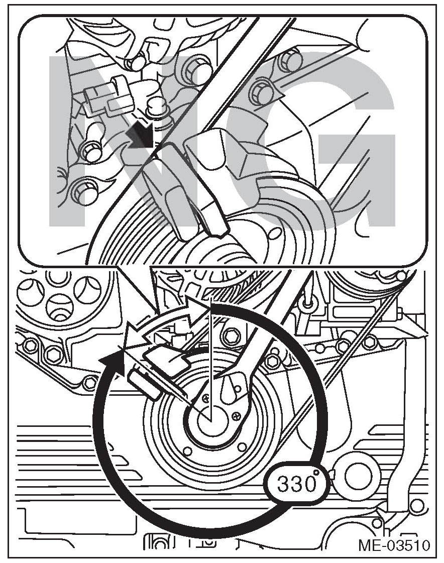 8) Slowly turn the crank pulley clockwise until the belt guide comes to approximately 45 degrees.