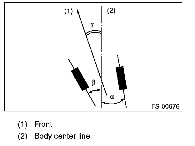 Thrust angle is a mean value of left and right wheel toe angles in relation to the vehicle body center line. Vehicle is driven straight in the thrust angle direction while slanting in the oblique direction depending on the degree of the mean thrust angle.