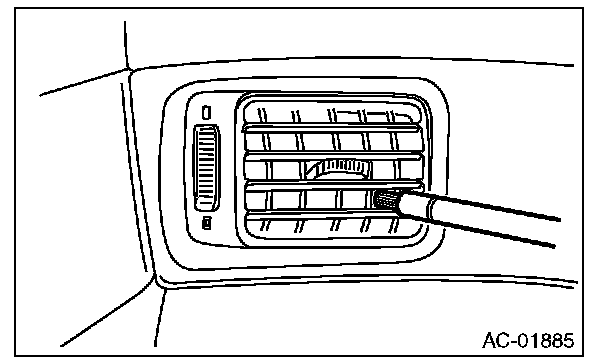 6. Turn the ignition switch to the ON, and run the blower at high speed for approx. 1 minute. Stop the blower to check the ventilation grille on the instrument panel. While moving the tester closer to the grille, run the blower for 1 or 2 seconds, then stop it. Check the grille at that position for at least 10 seconds.
