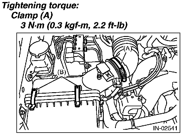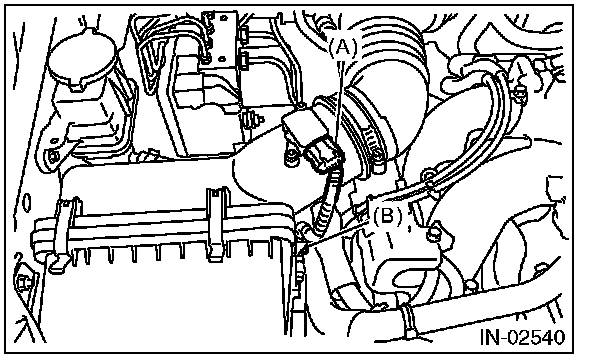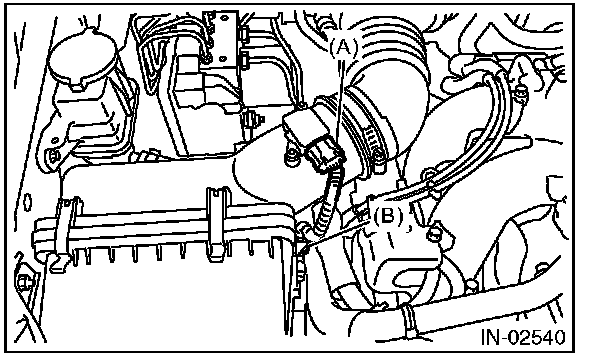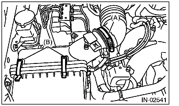 3. Disconnect the connector (A) from the mass air flow and intake air temperature sensor, and remove the clip (B).