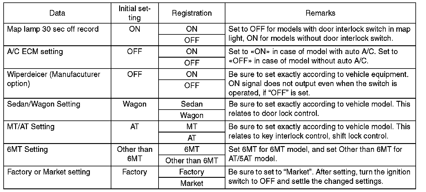 If registrations and function setting are different from vehicle equipment, vehicle system does not operate normally and diagnosis cannot be performed correctly. Pay attention to following item.