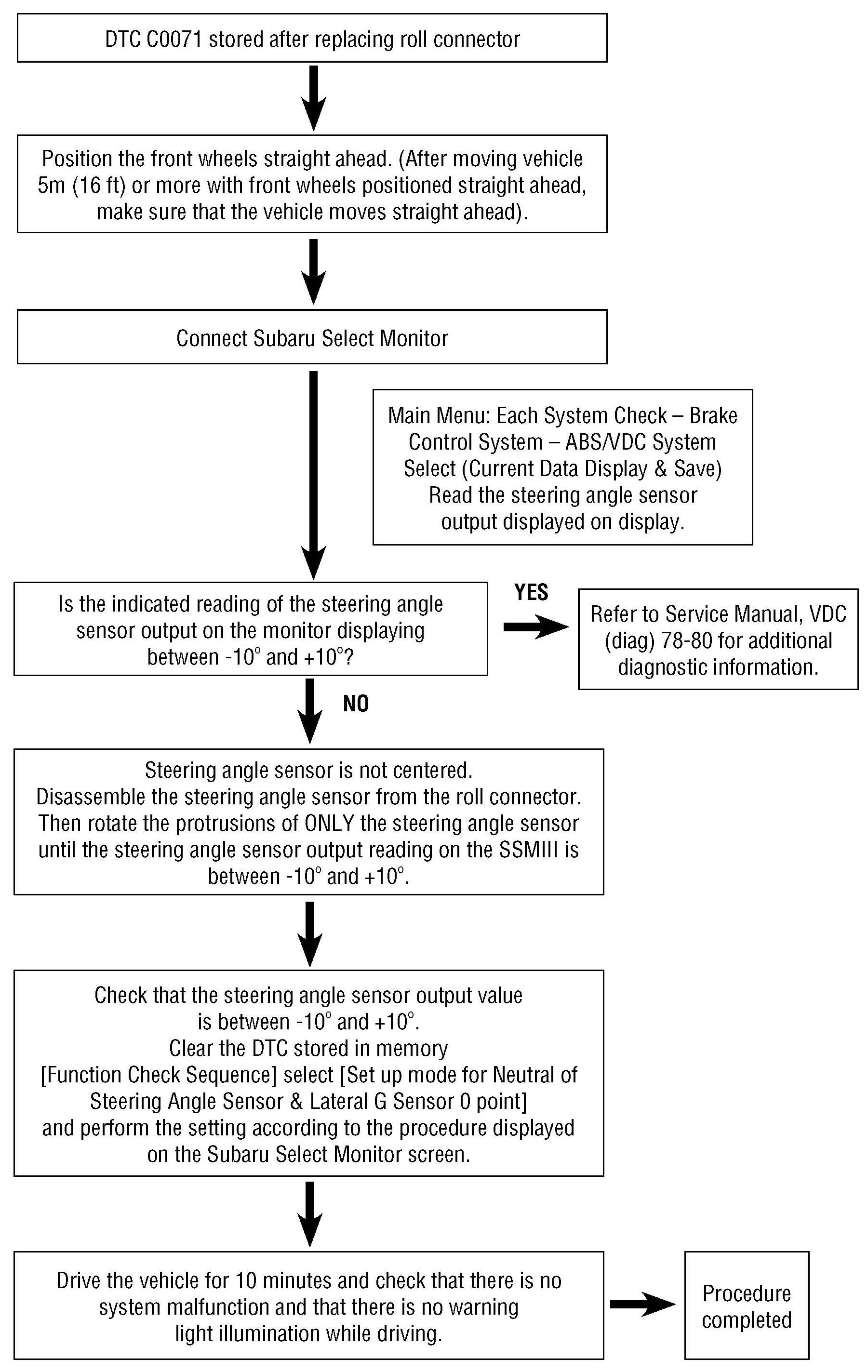 In addition to the flow chart refer to the applicable Subaru Service Manual VDC (diag) 78-80 for detailed information and any cautions listed when performing the following steps.