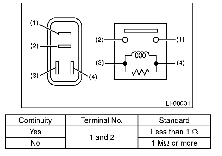 Connect terminal No. 4 to the battery positive terminal and terminal No. 3 to the battery ground terminal, and measure the resistance between tail and illumination relay terminals.