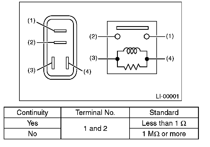 Connect terminal No. 4 to the battery positive terminal and terminal No. 3 to the battery ground terminal, and measure the headlight relay resistance between terminals.