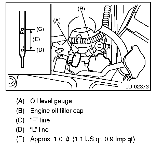 4) Remove the oil level gauge again and check the reading. If the oil level is below the "L" line, add oil to bring the level up to the "F" line.