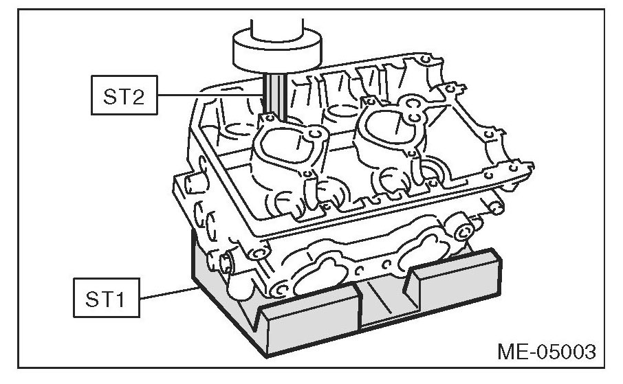(1) Place the cylinder head on ST1 with the combustion chamber upward so that valve guides fit the holes in ST1.