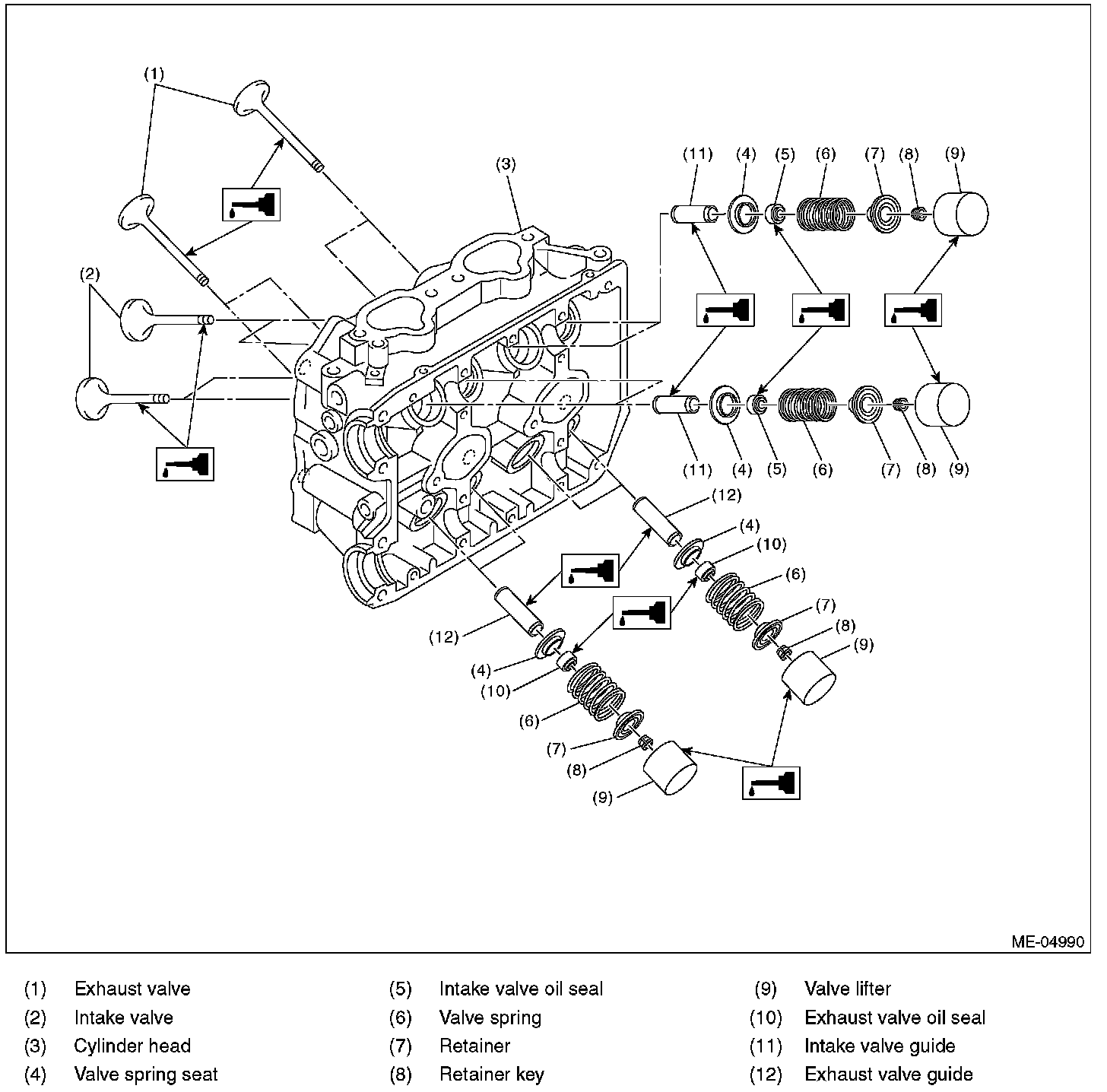 2) Put a small amount of grinding compound on the valve seat surface, and lap the valve and valve seat surface. Replace with a new valve oil seal after lapping.
