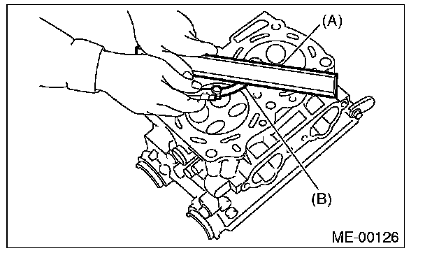 2) Measure the warping of the cylinder head surface that mates with cylinder block using a straight edge (A) and thickness gauge (B).