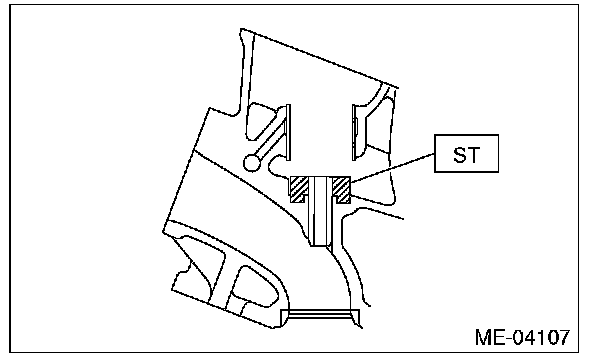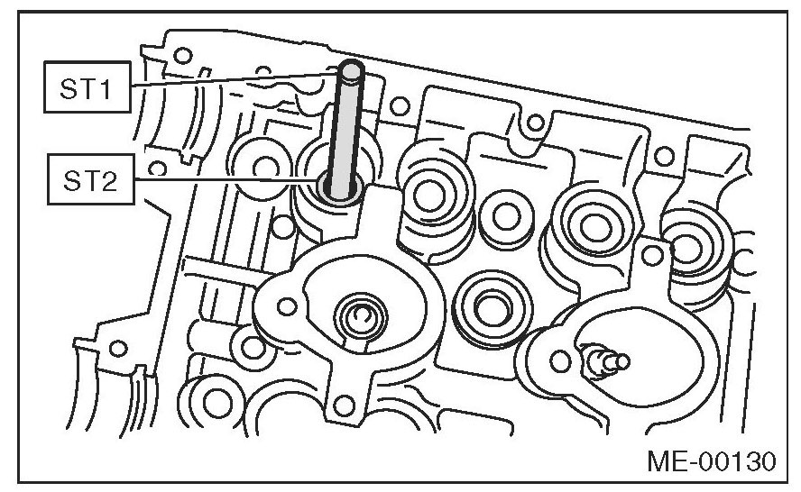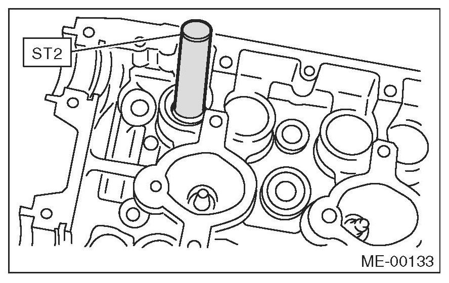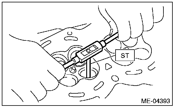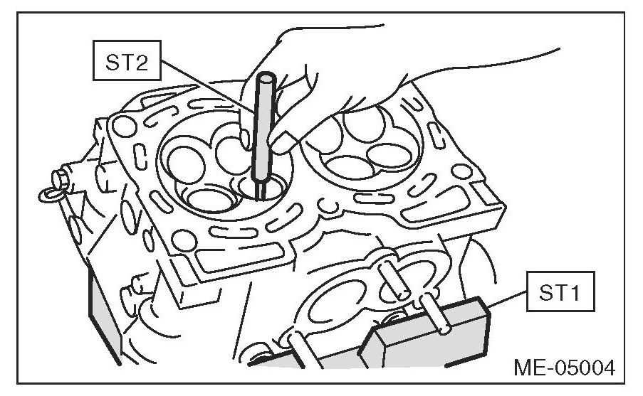 (5) Put a new valve guide, coated with sufficient oil, in the cylinder head, and insert the ST1 into valve guide. Press in until the valve guide upper end is flush with the upper surface of ST2.