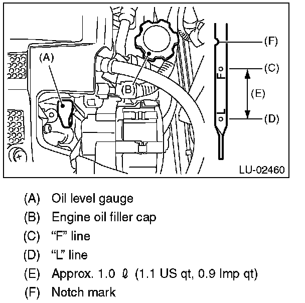 4) Pull out the oil level gauge again, and check the oil level. If the engine oil level is below "L" line, check for oil leakage from engine and add oil to bring the level up to "F" line.