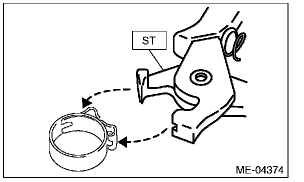 NOTE: Use a new clamp for the PCV hose assembly, fit the cut out in the ST with the protrusion on the clamp as shown in the figure, and lock the clamp.