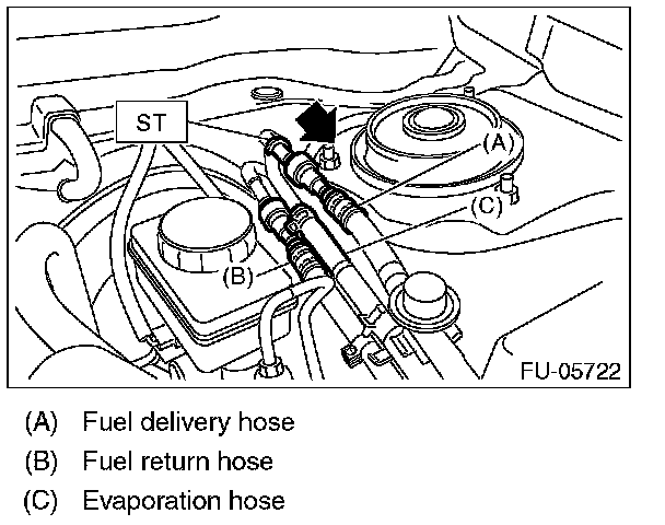 2. Disconnect the quick connector of the fuel delivery hose and fuel return hose by pushing the ST in the direction of the arrow.
