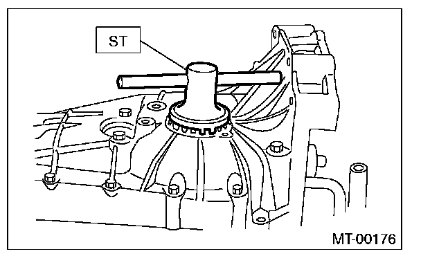 10) Screw the side retainer from the bottom into left case using ST2. Fit the ST3 on transmission main shaft. Shift the gear into 4th or 5th, and turn the shaft several times. Screw in the retainer while rotating the ST3 until a slight resistance is felt on ST2. This is the contact point of the hypoid gear and the drive pinion shaft. Repeat the above sequence several times to ensure the contact point.